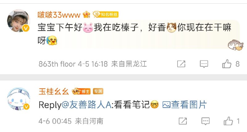 被回复的评论 8 小时前 @啵啵33www: 宝宝下午好[兔子]我在吃榛子,好香[喵喵]你现在在干嘛呀